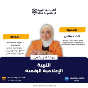 انضموا إلينا في #ورشة “التربية الإعلامية الرقمية” ضمن برنامج تدريبات أكاديمية التربية الإعلامية الرقمية في اليمن 2025، مع الخبيرة الأستاذة لقاء حمالس – مراقبة محتوى إعلامي ومدربة متخصصة في التربية الإعلامية والمعلوماتية بمعهد الإعلام الأردني.