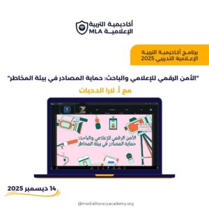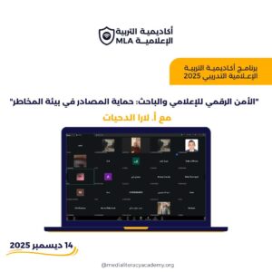ضمن برنامج أكاديمية التربية الإعلامية الرقمية – اليمن 2025، اختتمنا جلسة تدريبية متخصصة بعنوانـ: “الأمن الرقمي للإعلامي والباحث: حماية المصادر في بيئة المخاطر”، قدّمتها الأستاذة لارا الدحيات، خبيرة في الأمن الرقمي والأمن السيبراني والذكاء الاصطناعي، وتمتلك خبرة واسعة في تدريب الإعلاميين والشباب، مع تميزها في تبسيط المفاهيم التقنية المعقّدة وربطها بالسياق الإعلامي والبحثي.