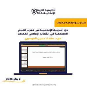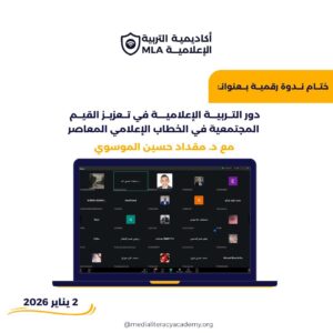 تتقدم أكاديمية التربية الإعلامية بخالص الشكر والتقدير للدكتور مقداد حسين الموسوي على عطائه العلمي المتميز، وجهوده الأكاديمية الرصينة، ومبادرته القيّمة، كما تشكر جميع المشاركين والمتابعين على حضورهم وتفاعلهم البنّاء.